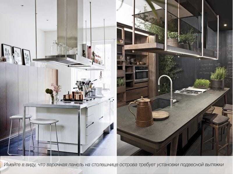 - остров с электрической варочной поверхностью организовать уже сложнее. Мало того, что придется подводить электричество (вести кабель лучше по полу), так еще и вытяжку придется предусмотреть. Выбирать придется специальную модель, да еще и воздуховод провести, а потом спрятать его за потолочной конструкцией (подойдут натяжные и подвесные потолки). Это значит, что придется пожертвовать высотой помещения. Но выход есть – можно приобрести вытяжку с рециркуляцией. Она втягивает воздух, очищает его и возвращает обратно. Фильтры придется менять часто, но если потолки низкие – это единственный вариант;