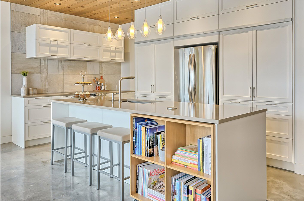 - остров-витрина предполагает наличие большого количества открытых полок, где красиво расставляют тарелки, сувениры, книги. Для пущего эффекта полки можно подсветить при помощи светодиодной ленты или специальных мебельных светильников. Открытые шкафы и полки могут располагаться по всему периметру острова, а могут украшать только его часть, например, ту, которая повернута к столовой зоне или гостиной.