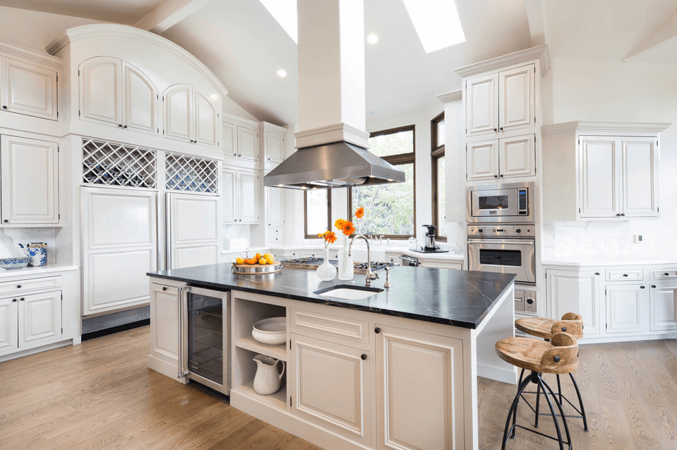 Красивое сочетание благородного дерева с белым гарнитуром и черной мраморной столешницей