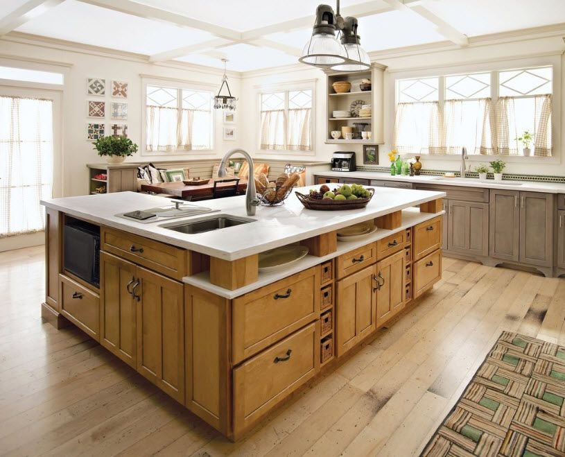 - Функциональность. Современные кухни с островом предполагают увеличение количества основных модулей: 2 плиты, 2 мойки и т.д. Это позволяет комфортно находиться на кухне сразу нескольким хозяйкам. Иногда встречаются интерьеры, в которых остров является основным рабочим местом, а гарнитур как таковой отсутствует. Это позволяет оставить больше пространства для обустройства гостевой и обеденной зоны. Однако стоит помнить, что в этом случае к острову предъявляются повышенные требования, поэтому он должен быть внушительных размеров, чтобы вместить всю технику, посуду и мелкую кухонную утварь.