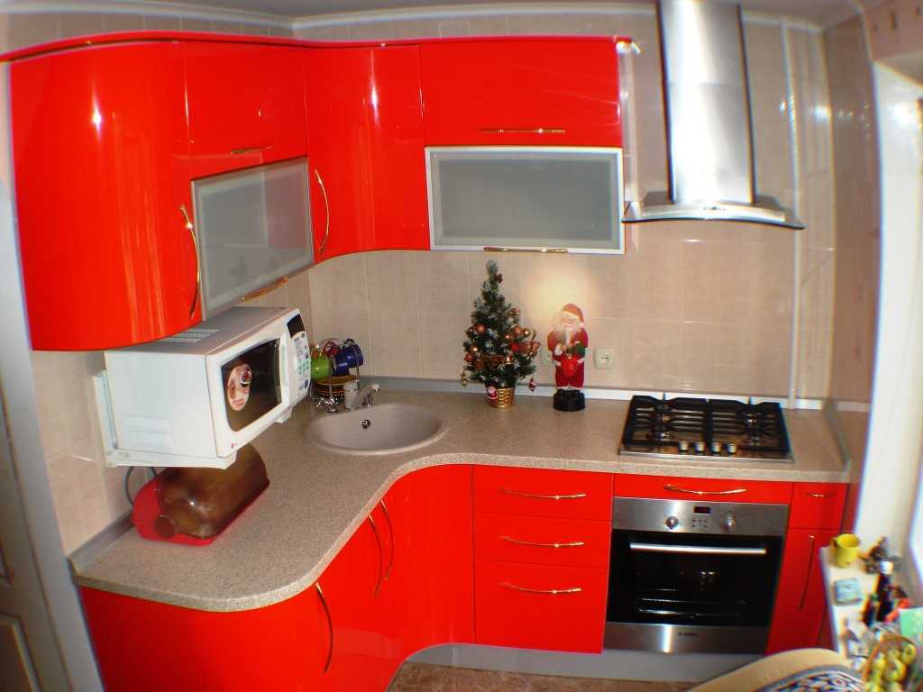 Угловой гарнитур компактных размеров отлично впишется и в квадратную, и в прямоугольную кухню. Удачный вариант для небольшой кухни в хрущевке – угловой гарнитур с барной стойкой: она может быть продолжением столешниц или размещаться перпендикулярно.