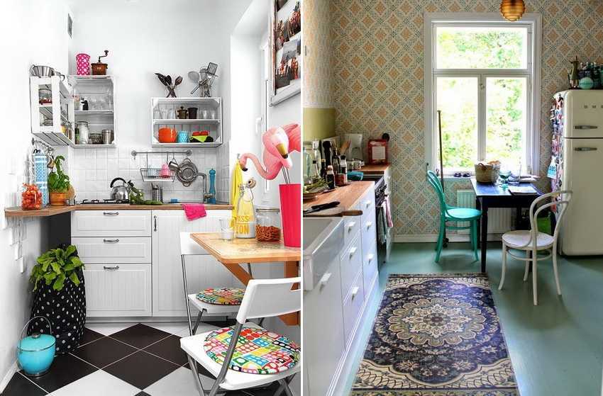 Уделить внимание следует и расцветке изделий, которые должны быть продолжением цветовой гаммы интерьера или гармонично контрастировать с ним. Для создания уютной атмосферы в маленькой кухне лучше придерживаться сочетания светлых тёплых оттенков