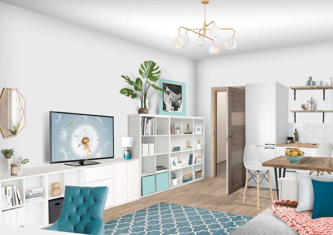 Изначально я хотела разместить стеллаж и телевизор у стены рядом с кухонной зоной, а раскладной диван напротив.