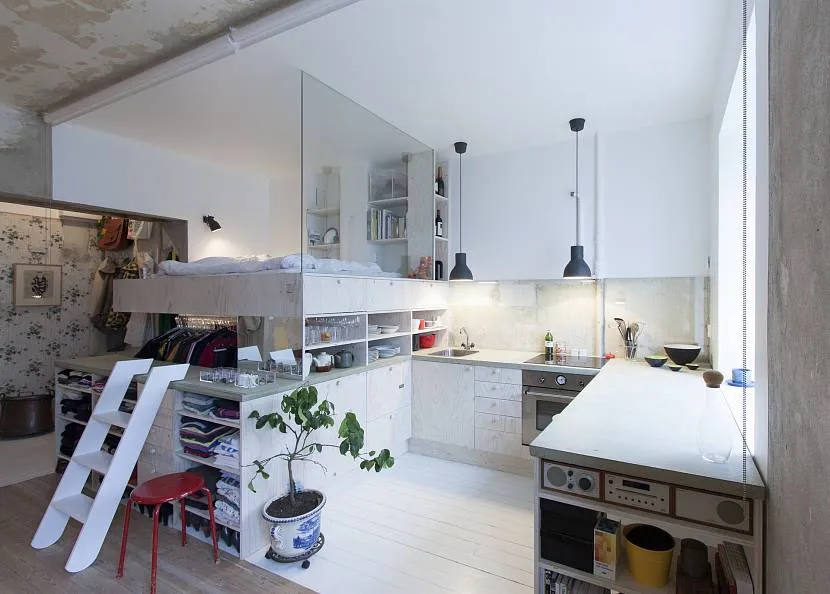 На фото двухуровневая квартира-студия 20 кв. м., выполненная в стиле лофт.