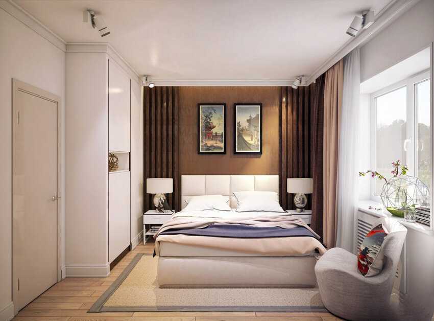 Для маленькой спальни прямоугольной формы рекомендуется П-образная планировка в разных интерпретациях: с кроватью у окна, изголовьем или боком к одной из стен и даже посередине комнаты.
