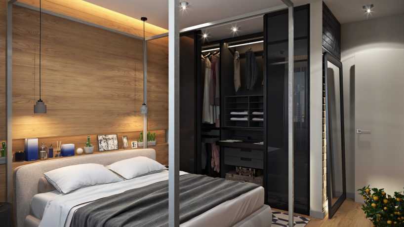 Более приемлемым вариантом станет расположение гардеробной в изголовье кровати, установленной вдоль одной из удалённых стенок. Такое решение скроет недостаток «вытянутости». Встроенный шкаф может быть двух видов: