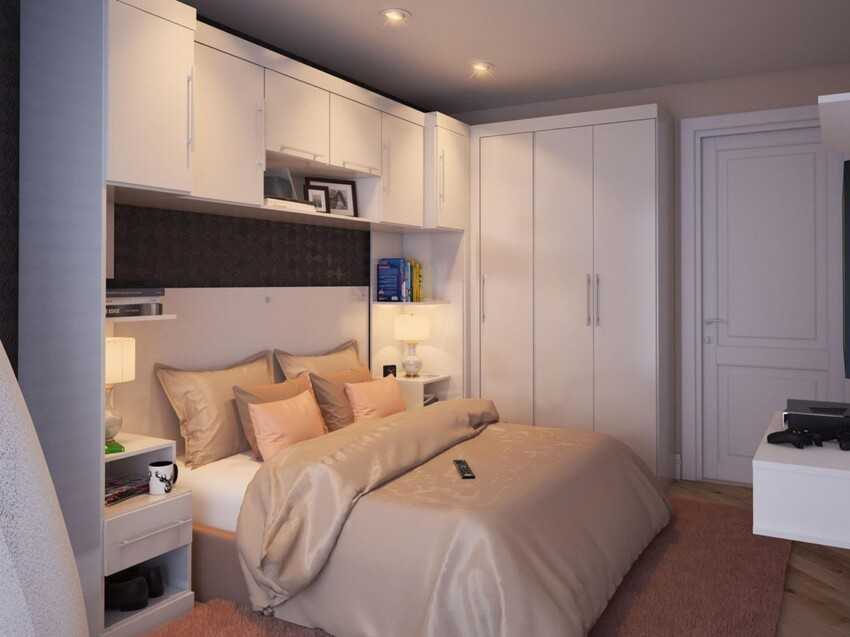 В большой, просторной спальне воздержитесь от размещения мебели строго по периметру вдоль стен. Такой прием визуально негармоничный. Для небольших же комнат существуют иные рекомендации по эргономике, которые помогут существенно сэкономить пространство в спальне: