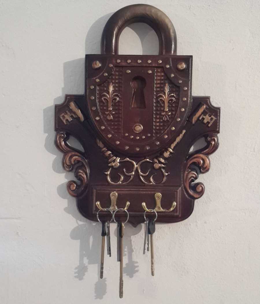Если ключей много, можно сделать «многостраничник». Этот вариант подойдет для гостиниц, домов отдыхаНастенная ключница украшается всем чем угодно. Если вам нравятся камни, то можно и их приклеитьЕсли ключи дороже денег… есть ключницы с кодовым замкомМожно использовать как подарокС узорами и элементами ковки. Для некоторых интерьеров прямо находкаС юморомС отдельным «встраиваемым» брелоком для каждого члена семьиГлавное — не перепутать с обычной розеткойЕсли владеете техникой инкрустации, в достоинства превратить можно даже гниль в древесинеМожно использовать очень мелкую мозаику