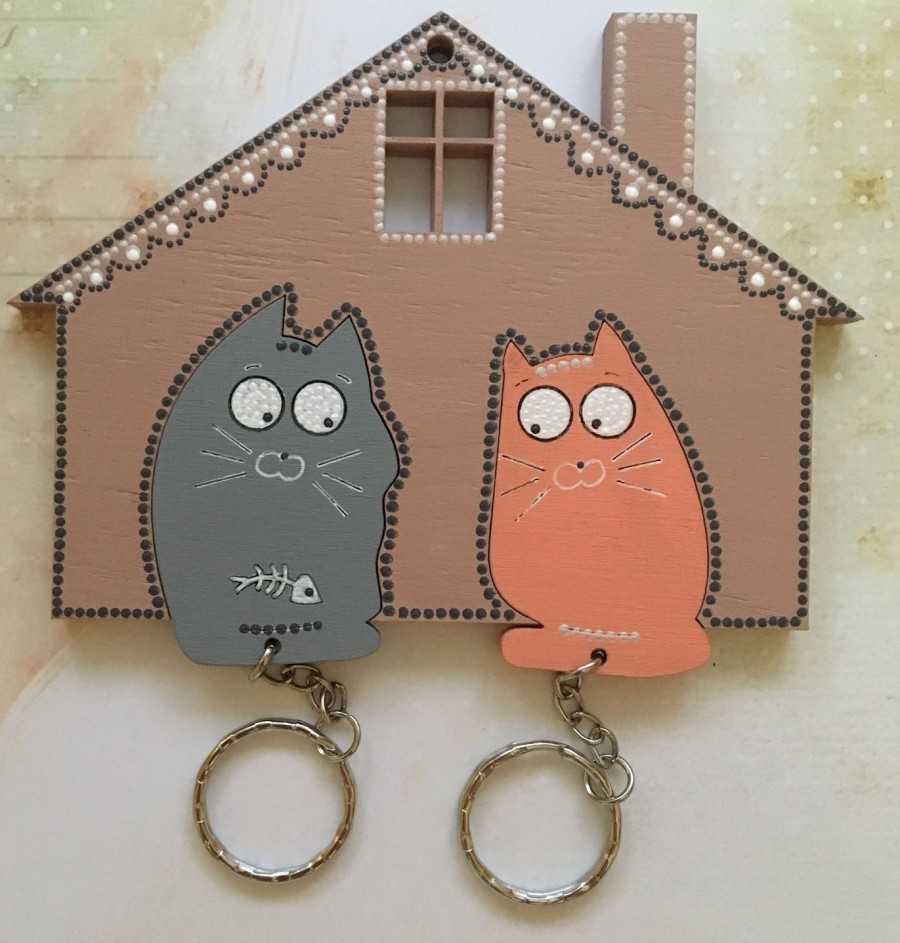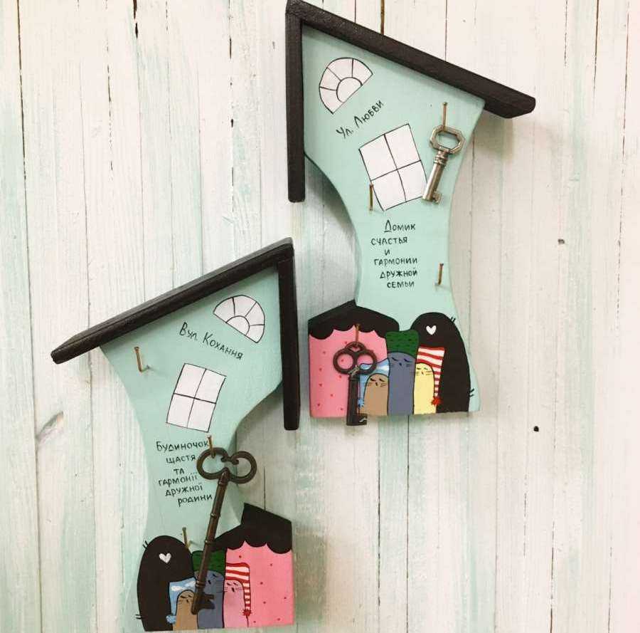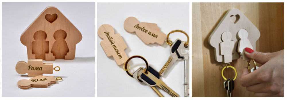 В форме маленького дома выполнена ключница из тонкой древесины. Его обитателями являются две деревянные фигурки, которые вынимаются вместе с ключами. Фронтон домика украшает маленькое сердце, а брелки выполнены в виде мужчины и женщины. Фигурки партнеров соединяются в вечернее время, когда ключи помещаются в жилище.
