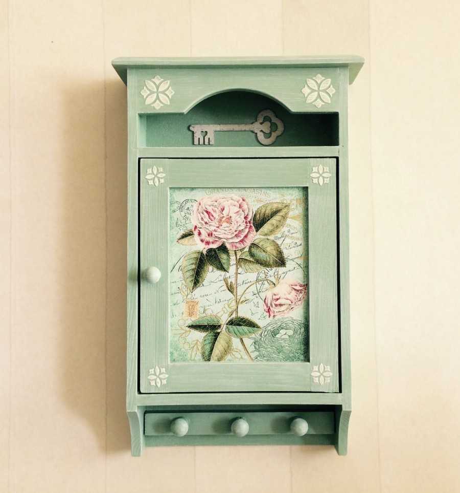 Солидности обстановке прибавит хранитель ключей в форме правильного четырёхугольника со стеклянной дверцей. А изделие, декорированное при использовании техники декупаж, всегда будет выглядеть великолепно. Оно, несомненно, понравится всем членам семьи. В качестве тематики рисунка могут выступать мотивы винтажа или сказок.