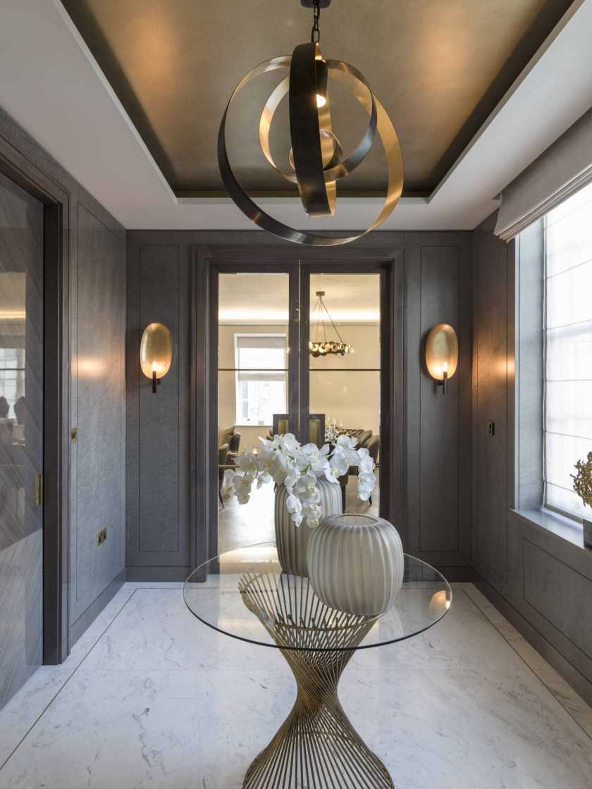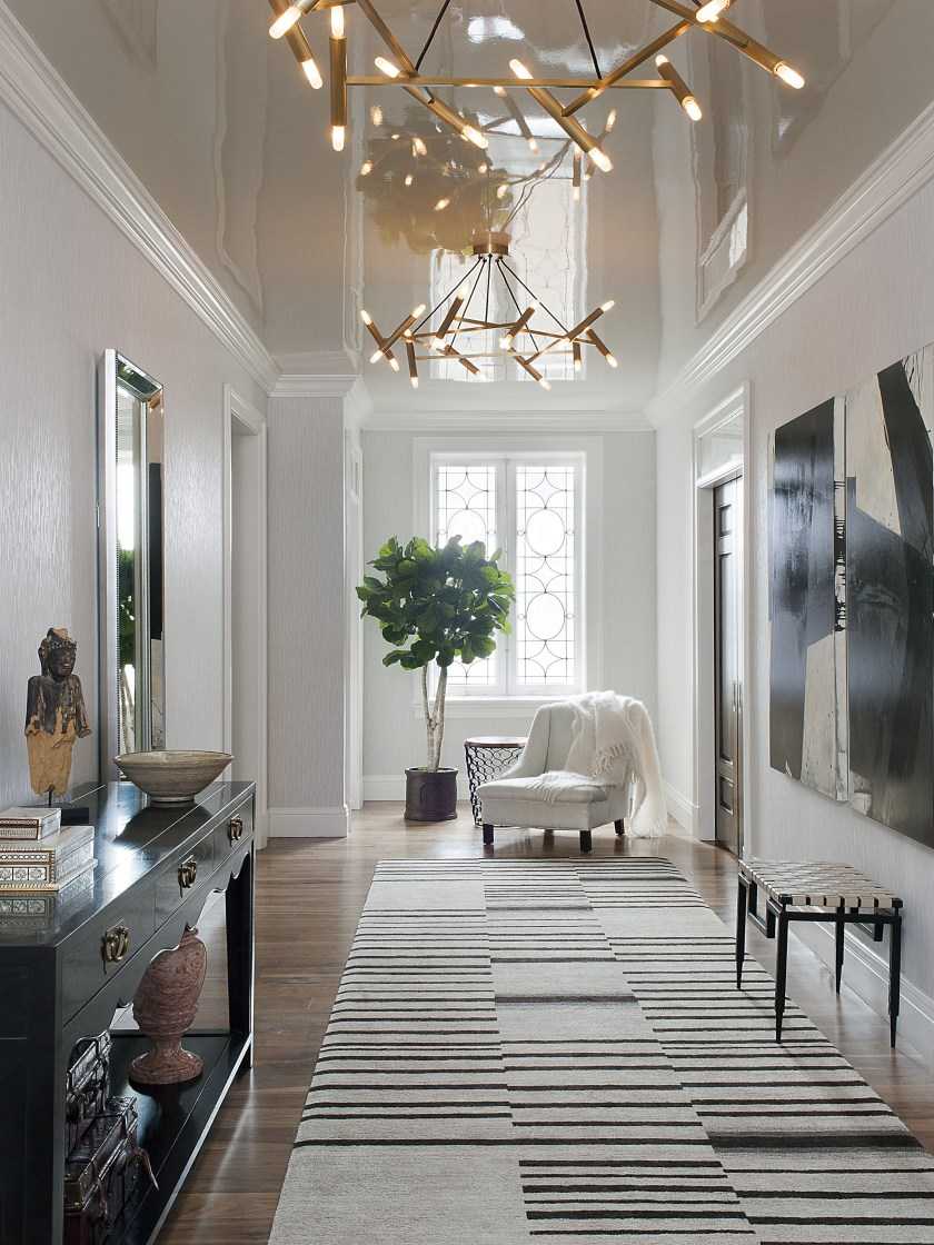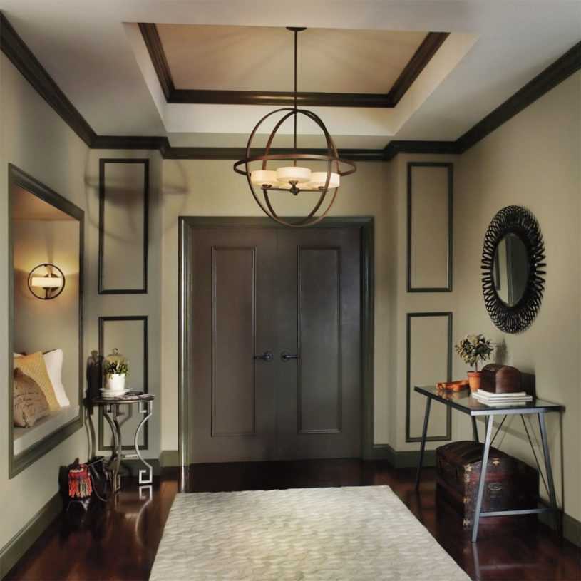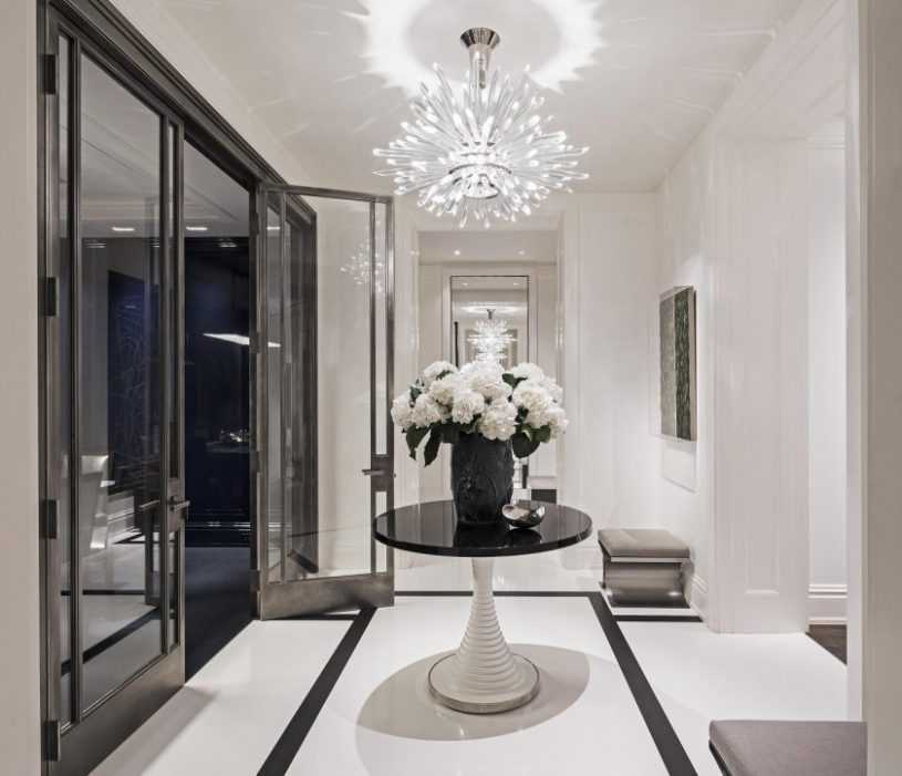 - Коридорное пространство, отличающееся квадратной конфигурацией оснащают большим центральным светильником, который выступает в качестве главного акцента.