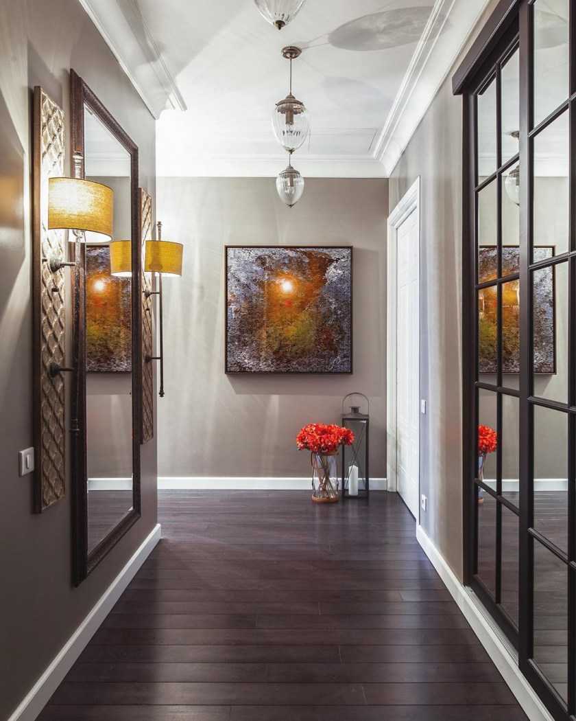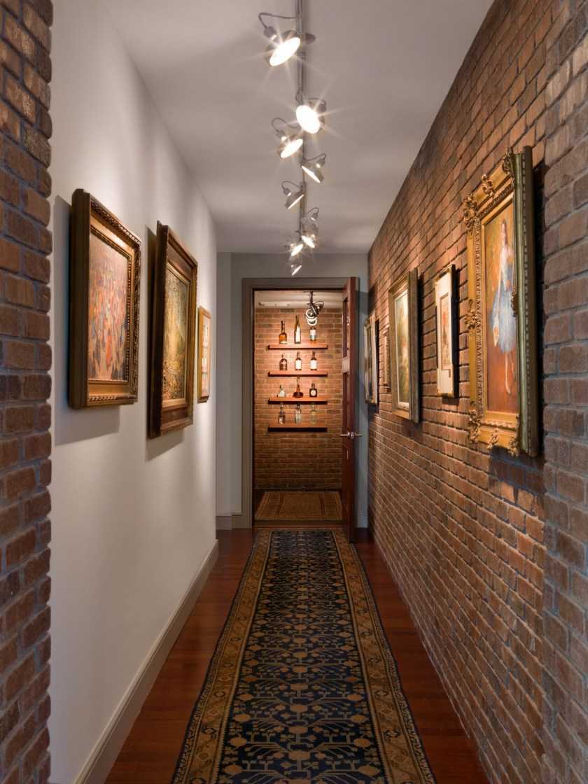 - Длинная вытянутая прихожая. Особый акцент делают на освещение стен. Светильники могут быть расположены на стенах или потолке, но свет от них должен быть направлен на верхнюю часть стен. Этот эффект поможет визуально помещение сделать шире. Еще больше эффект будет, если одна из длинных стен будет оформлена зеркалом, желательно, во всю стену.