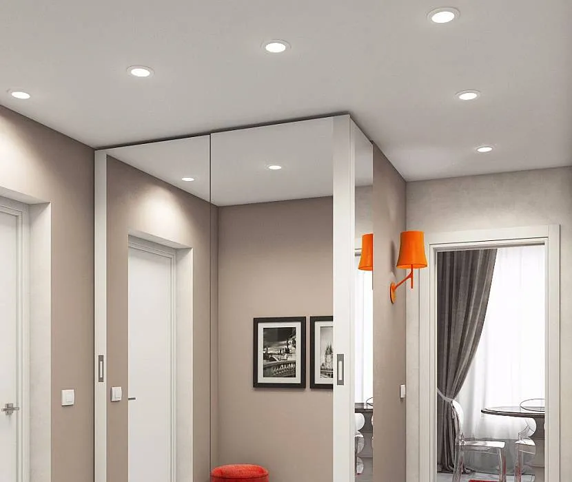 На фото потолочное освещение в прихожей, расположенное над дверью и над зеркальным купейным шкафом.