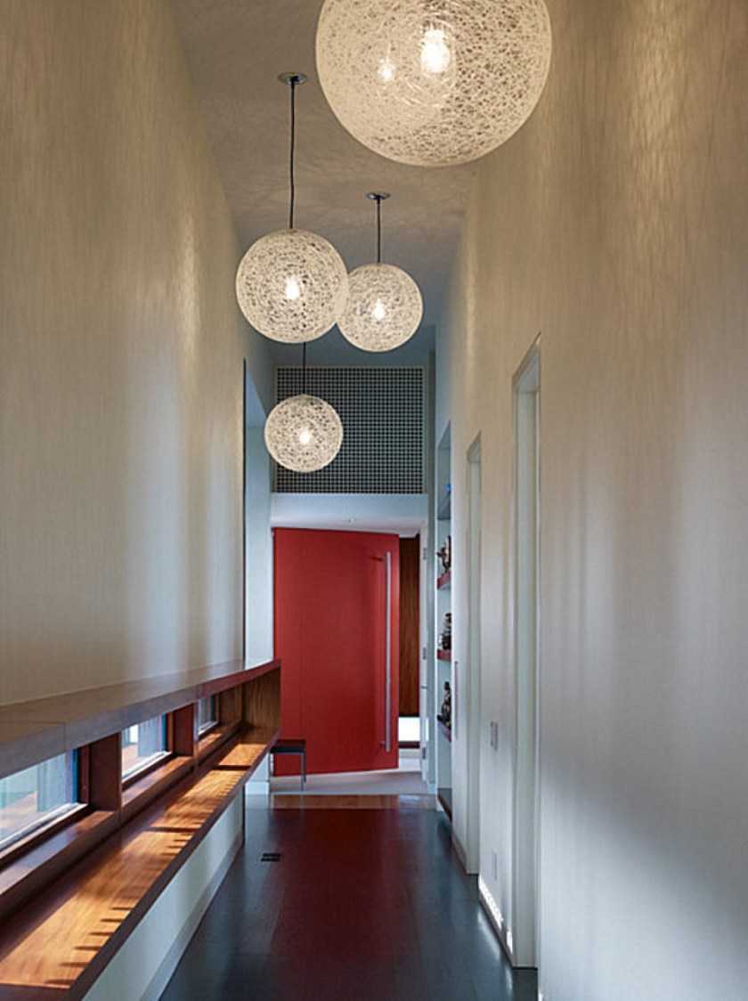 - Прихожую с высоким потолком уместно дополнить низко опущенными подвесными лампами. Если помещение имеет вытянутую форму, устанавливают несколько светильников.
