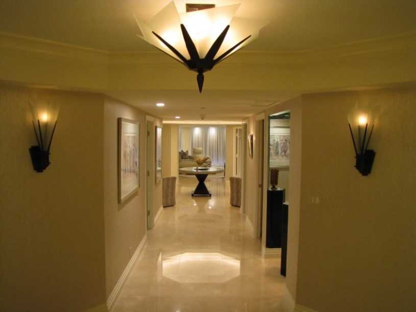 чтобы сделать коридор пошире, необходимо установить по несколько светильников, свечение от которых должно направляться на противоположную стену. Верхние светильники нужно развернуть на стены, а не на пол;