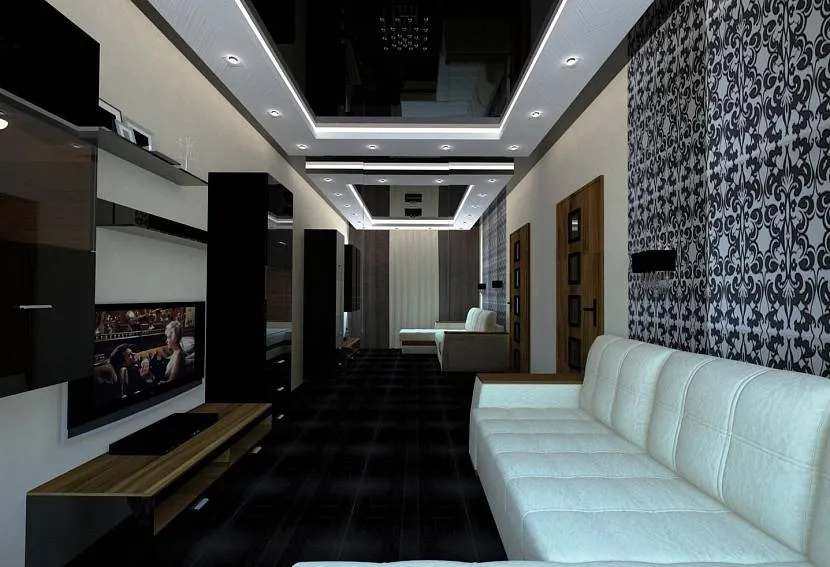 Отделка потолка черным ПВХ-полотном в центре в узкой гостиной комнатеИсточник bouw.ru