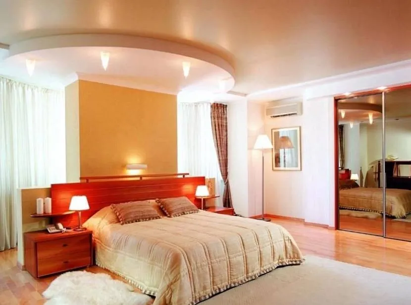 Благодаря тому, что в потолок из гипсокартона легко встраиваются сложные системы освещения, в спальне можно создать спокойную романтичную атмосферу. Даже объемные многоуровневые потолки не выглядят громоздко и не создают зрительного напряжения.