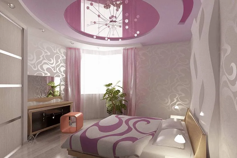 Спальная с розовым натяжным потолком из ПВХИсточник potolki-nikomaks.ru