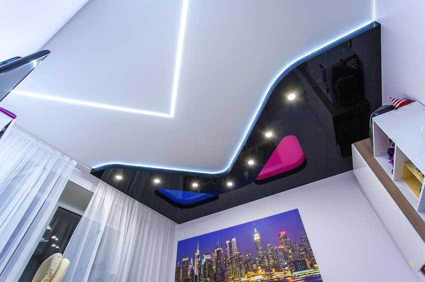 Световое оформление. Используя натяжные потолки, также открывается больше возможностей для создания уникального освещения. Подсветить потолок можно изнутри, создавая таким образом потрясающий эффект. Ярким примером является очень популярное оформление в виде звездного неба, но вариаций, на самом деле, великое множество;