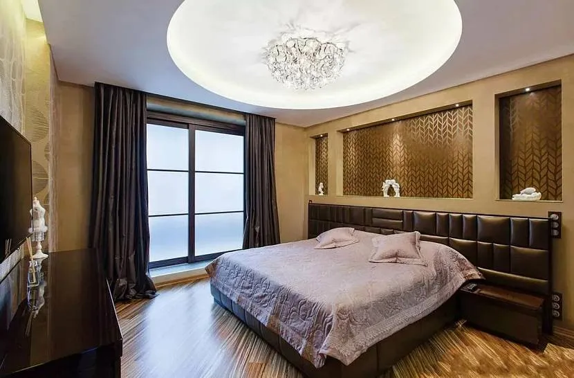 Натяжной ПВХ потолок для спальни предоставляет более широкий выбор цвета и фактуры. Гладкая плёнка может быть глянцевой или сатиновой, матовая – простой или фактурной. На каждой из них возможно нанесение оригинального узора, орнамента, фотопечати. Как уже понятно из информации, приведённой ранее, им свойственно 2 основных недостатка: