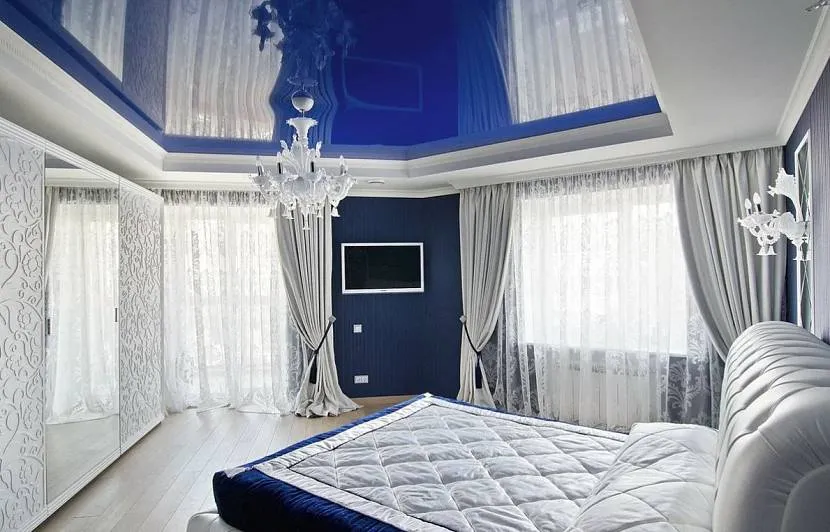 Навесной потолок спальной комнаты голубого цветаИсточник ampirpotolok.ru