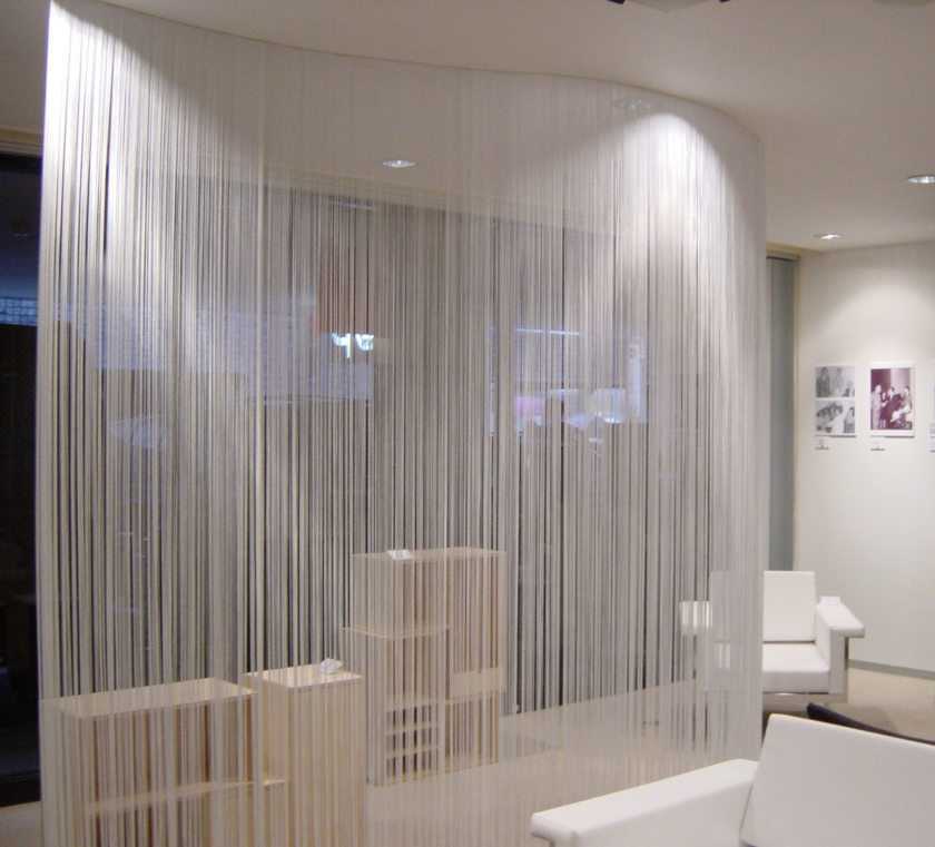 С помощью нитяных штор можно легко разделить помещение на зоны, при этом, не возникает ощущение тесноты. Благодаря воздушной, невесомой структуре создаётся уютная обстановка, и в то же время возникает обособленный участок.