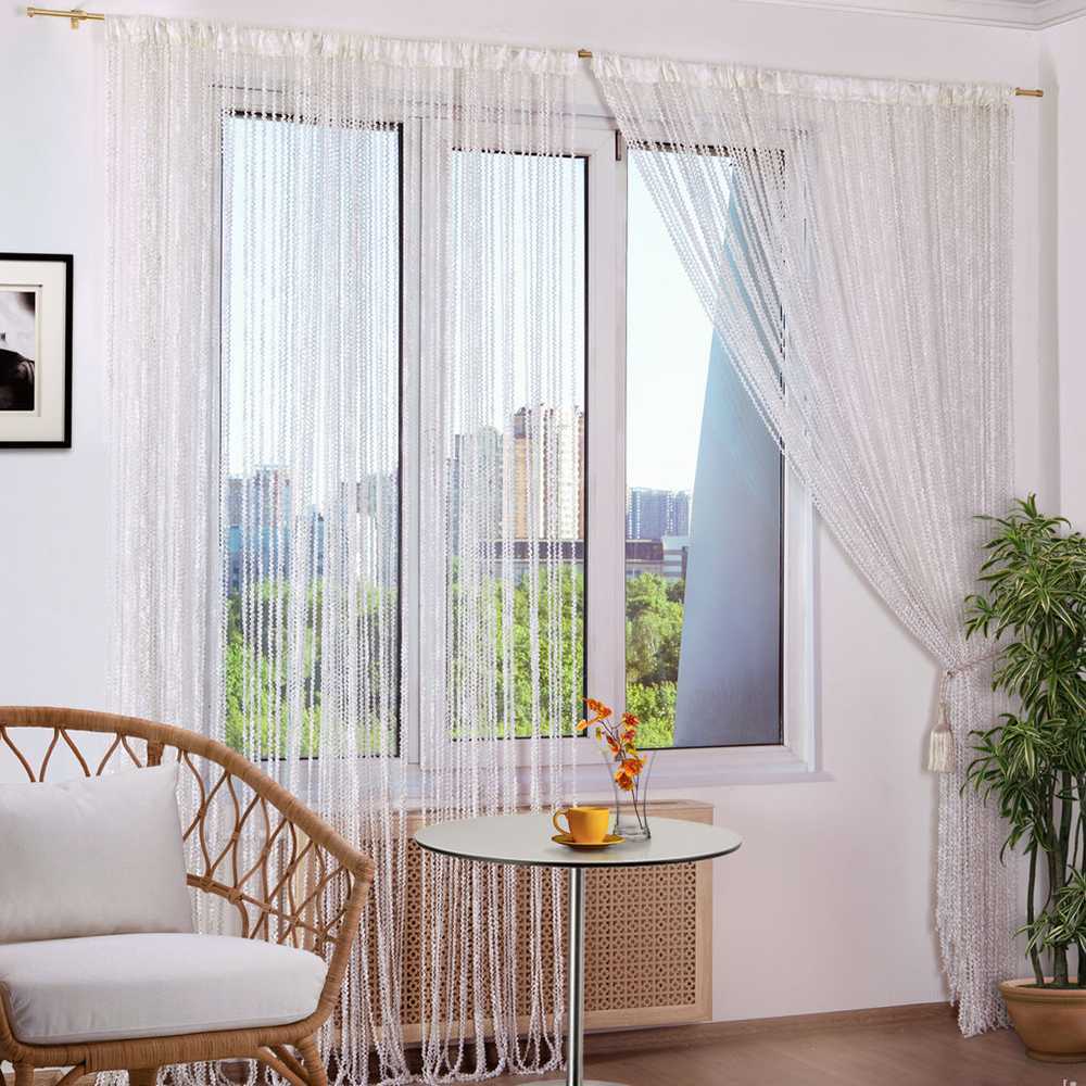 Красивые нитяные шторы являются отличный декорирующим элементом, что подходит практически под любой стиль. Их структура позволяет создавать праздничную атмосферу в доме без дополнительных затрат.