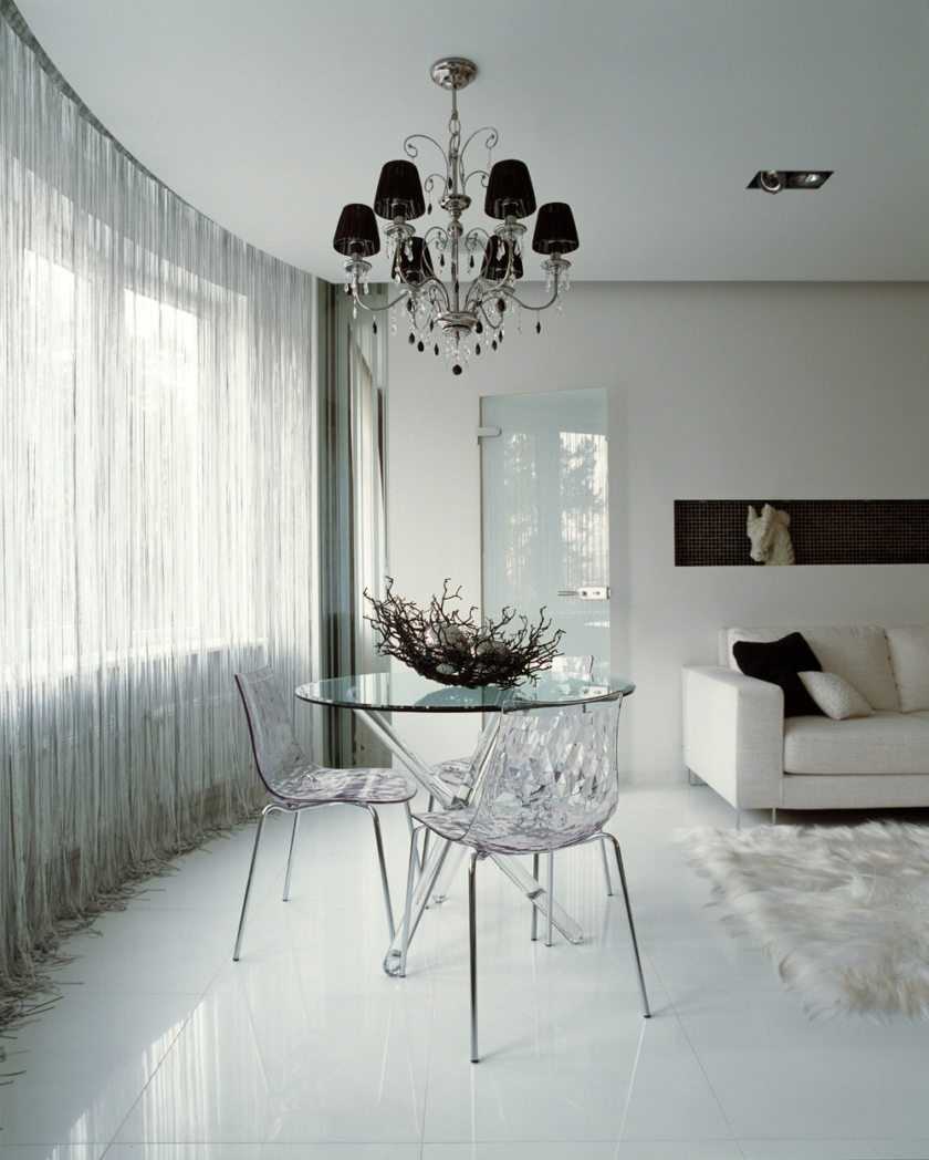 Простая кисея в дуэте с нитевыми шторами из люрекса зонирует гостиную и столовую
