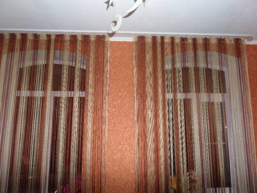Достаточно универсальные с точки зрения крепления. Итак, как повесить нитяные шторы. Верхнюю часть, что состоит из плотного фрагмента нитей, крепят. Подойдет любая поверхность.