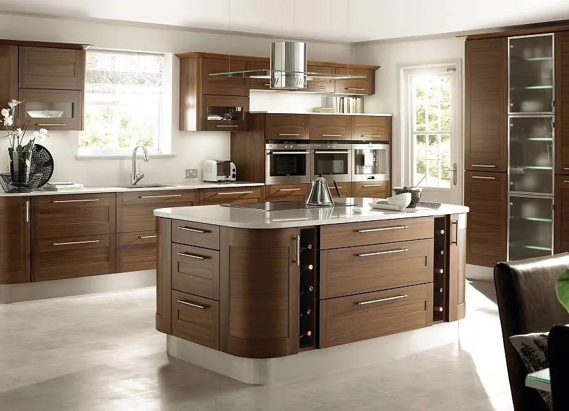 Островной гарнитур предполагает наличие стола по центру комнаты и уместен в частных и загородных домах, где подразумевается наличие отдельного помещения или зоны для приема пищи. Кухонный остров выполняет функции дополнительного рабочего стола, где может размещаться, раковина, плита, разделочные доски и посуда, или выполнять функцию барной стойки. Стиль, текстура и оттенок островка должен совпадать с кухонным гарнитуром.
