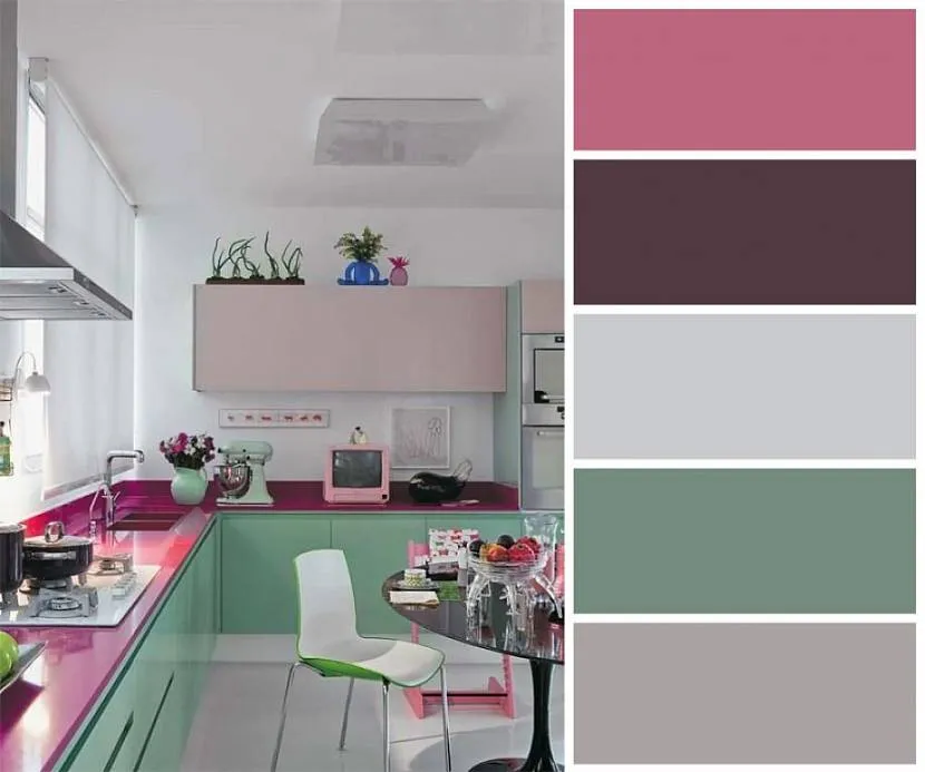 Светло-розовые стены в кухне с современным дизайномИсточник s-stroganov.ru