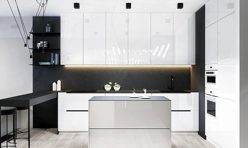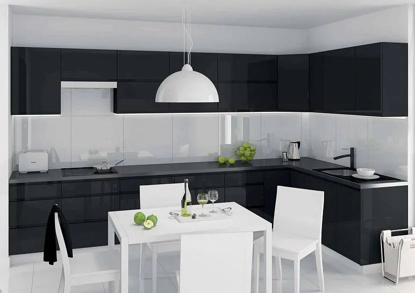 Черными могут быть некоторые элементы фасадов, кухонный фартук, пол. Главное, чтобы доминирующим оставался именно белый цвет, а черный только подчеркивал его чистоту и совершенство.