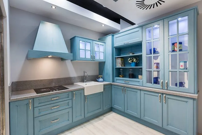 Голубой. Данный цвет не будет выглядеть вызывающим, если его разбавить белым линейным кухонным гарнитуром. Приветствуется добавление аксессуаров в светло-голубой палитре. Это могут быть накидки на стулья, прихватки, тканевые салфетки, римские шторы.