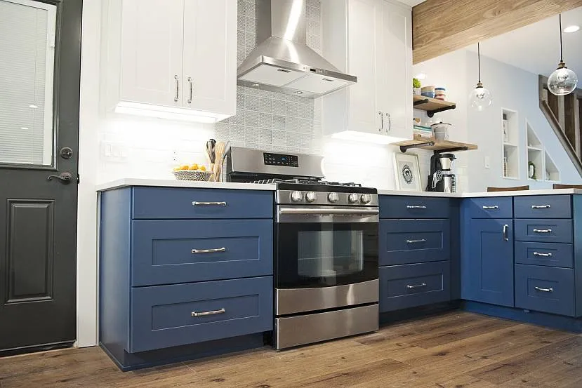 Белые стены и темно-синяя кухонная мебельИсточник wolfhomeproducts.com