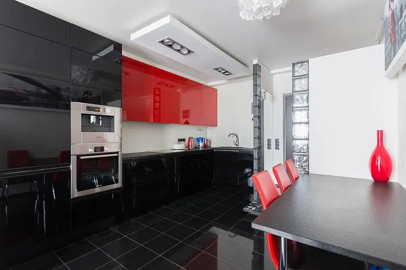 Черный с красным хорошо гармонируют если используются не только на стенах. Удачно смотрится интерьер при облицовке пола черным кафелем, использовании красного фасада гарнитура. Стены оставляют в белом или светло-сером.