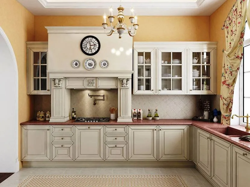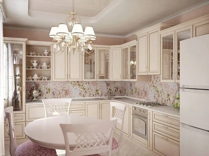 Интерьер классик распространен для оформления кухни. Ему присуще использование нежных пастельных оттенков: светло-розового, бледно-желтого, лунного, персикового, молочного. Такие тона лучше разбавлять масштабными порциями освещения. Стены в перечисленных тонах хорошо смотрятся с белым напольным покрытием и аналогичным фасадом гарнитура.