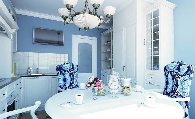 Оформление голубым цветом в небольшой кухне с обеденной зонойИсточник legkovmeste.ru