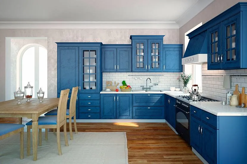 Шикарно смотрится синяя матовая мебель на фоне белых стен кухни. При облицовке фартуке можно использовать квадратную кафельную плитку с легким темным орнаментом. В таких кухнях хорошо бы использовать дополнительные цвета: коричневый — для пола и полок; серебристый металлик — в бытовых приборах.