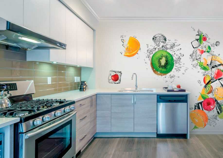 Для фартука на кухне лучше подойдут моющиеся водостойкие фотообои. Изображение выбирается в соответствии со стилем интерьера. Это может быть цветочный орнамент или урбанистический рисунок. Красиво смотрятся возле столешницы картины с изображением ягод, цитрусов.
