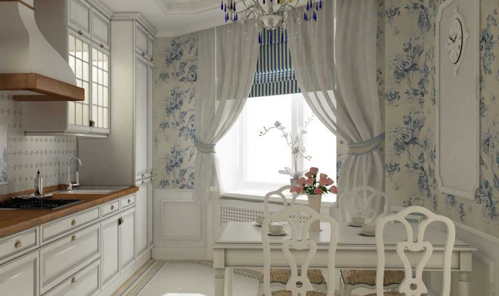 Прованс. Для отделки используют материалы светлых тонов с различными рисунками и узорами. Оптимальным вариантом станут оливковые, бежевые и лавандовые обои для кухни в стиле прованс.