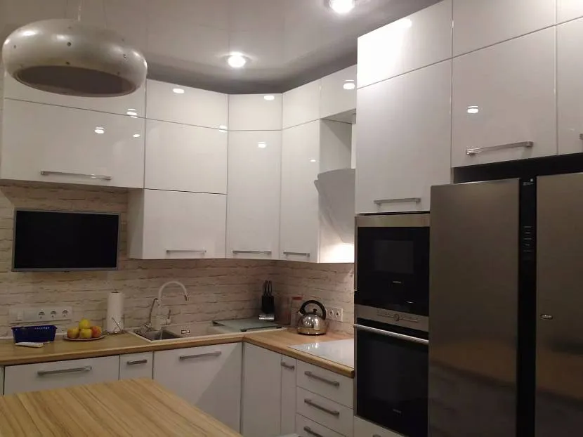 Белый – идеальная база для создания монохромной кухни в стиле хай-тек. Для этого стиля характерен блеск металлических и глянцевых поверхностей. Поэтому можно смело выбирать гарнитур с глянцевыми фасадами.