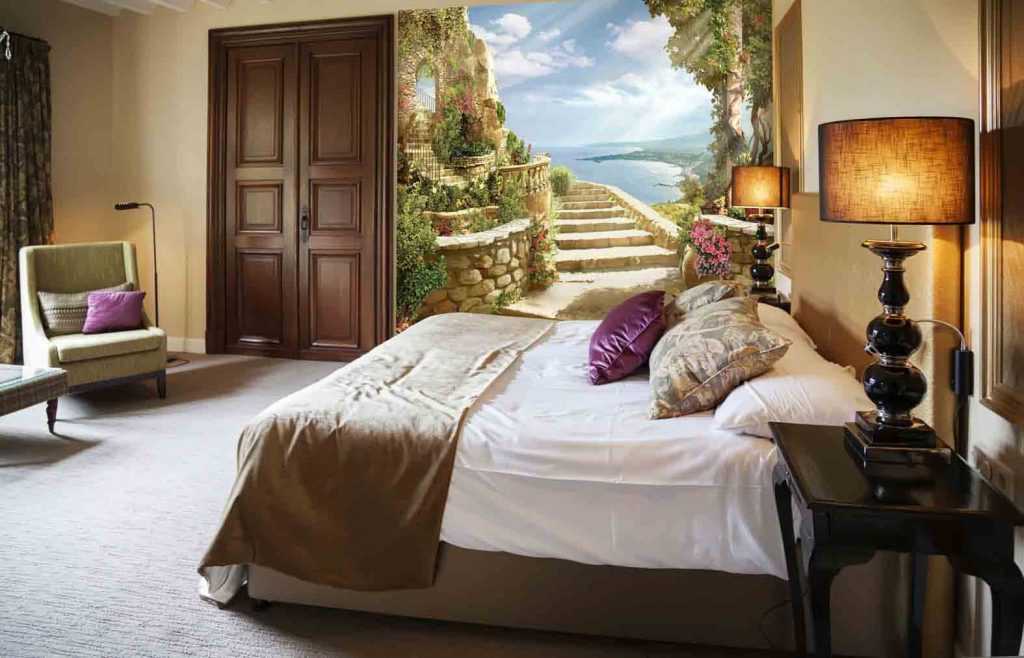 То же правило касается и видов природы, для спален больше подходит садовые и лесные дорожки, уходящие в перспективу, изображения вечернего сада в неярких и теплых тонах, орнаменты в виде крупных бутонов. Гармоничную атмосферу создаст изображение утреннего леса, морская тематика, туманная роща. Рисунок выбирается, исходя из личных предпочтений и уже имеющейся обстановки, что смотреться единым целым, а не диссонансным пятном.