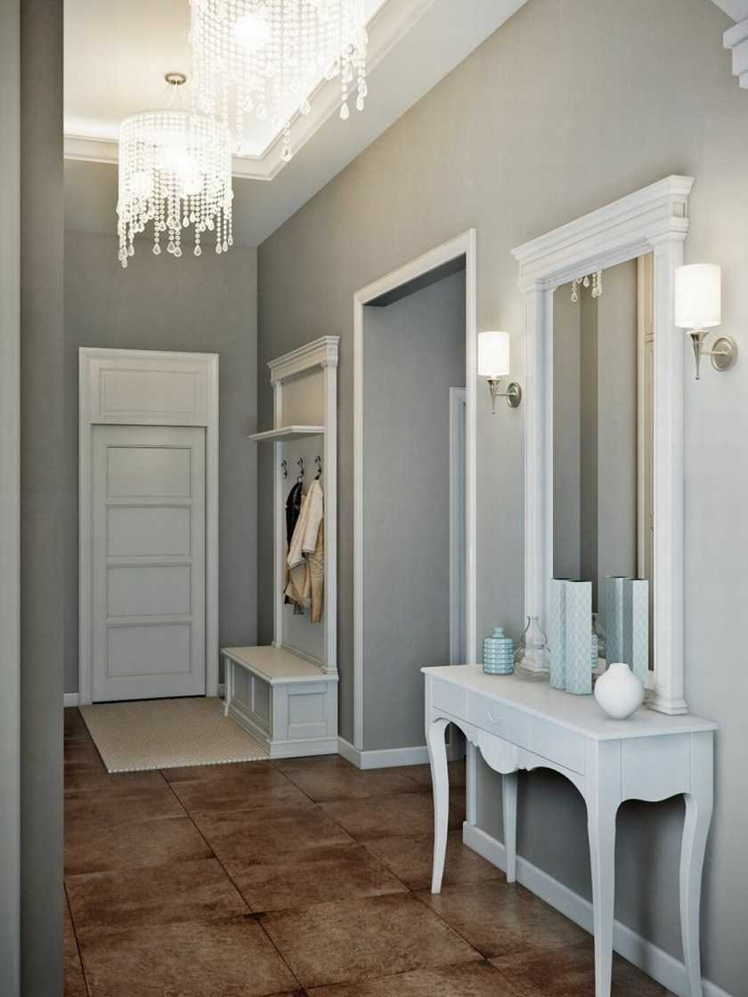 В интерьере прихожей в бежевых тонах, оформленной в классических стилях размещаются зеркала в деревянных рамах, люстры из бра из хрусталя или стекла. Мебель может быть украшена резьбой, позолотой. Необязательно приобретать дорогостоящие конструкции из дерева. Можно установить в прихожей мебель из МДФ, покрытую шпоном.