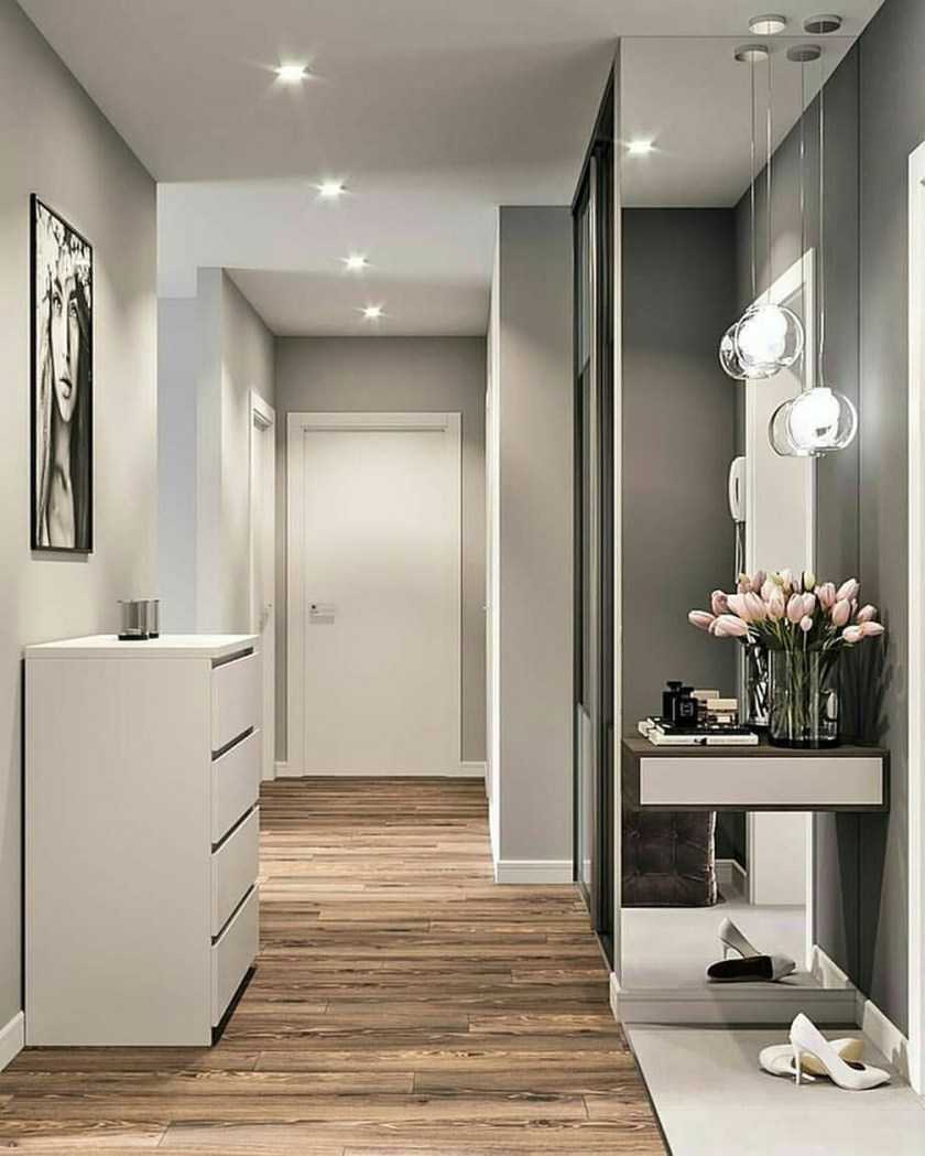 Однотипность серой прихожей разбавляют темными фасадами. Глянцевые раздвижные двери купе привнесут нотки роскоши в нейтральное матовое оформление. На светлом фоне яркой деталью станет черный пенал до потолка или акцентная стена. В маленьком пепельном или жемчужном коридоре уместна лаконичная вешалка и комод.