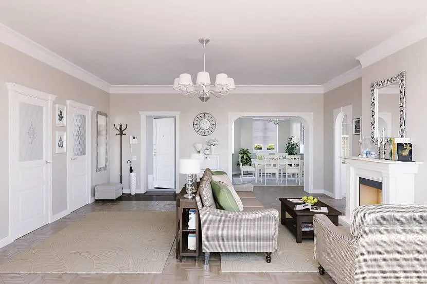 В интерьерах прихожих в бежевых тонах в таком случае будут уместны лепные карнизы, розетки, молдинги. Белоснежный гипс или его имитация будут отлично смотреться на таком фоне. В оформлении стен могут использоваться тисненые обои на основе флизелина, декоративная штукатурка. Хорошо подойдут полотна с позолоченными орнаментами, узорами. Напольное покрытие может быть деревянным или имитирующим текстуру древесины. Отличным вариантом станет плитка из натурального, искусственного камня, керамогранит.