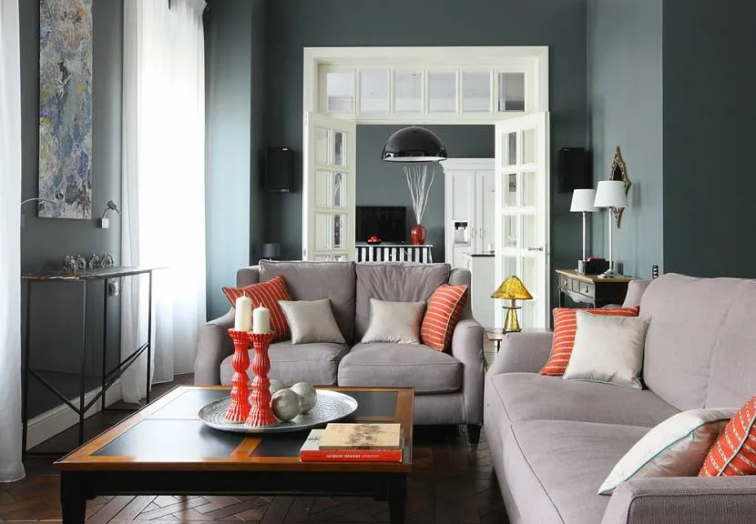 В небольшой гостиной предпочтительно использовать светло-серые двери, которые помогут расширить пространство и придать ему свежий и чистый вид.