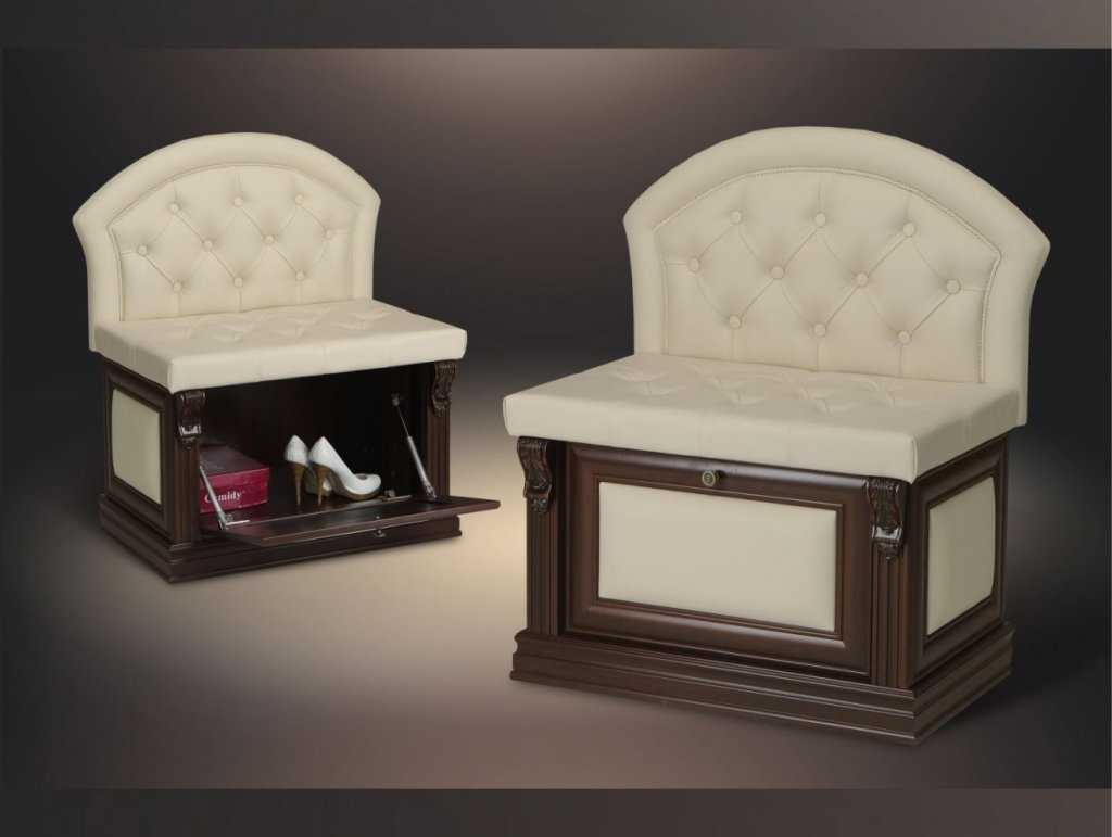 Из роскошных предметов мебели стоит отметить обувницу класса люкс. Модели изготавливают только из натуральных материалов: кожи и дерева. Отделка таких изделий, как правило, дорогая и выполняется с различными дополнениями в виде резьбы или гравировки.