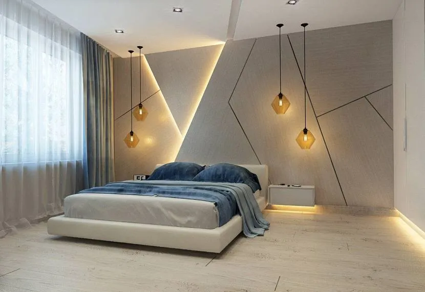 Иногда дизайн спальни требует нестандартных решений, например, подсветка натяжного потолка светодиодными лентами и пара подвесных светильников обеспечат должное освещение без люстры, бра и настольных осветительных приборов.