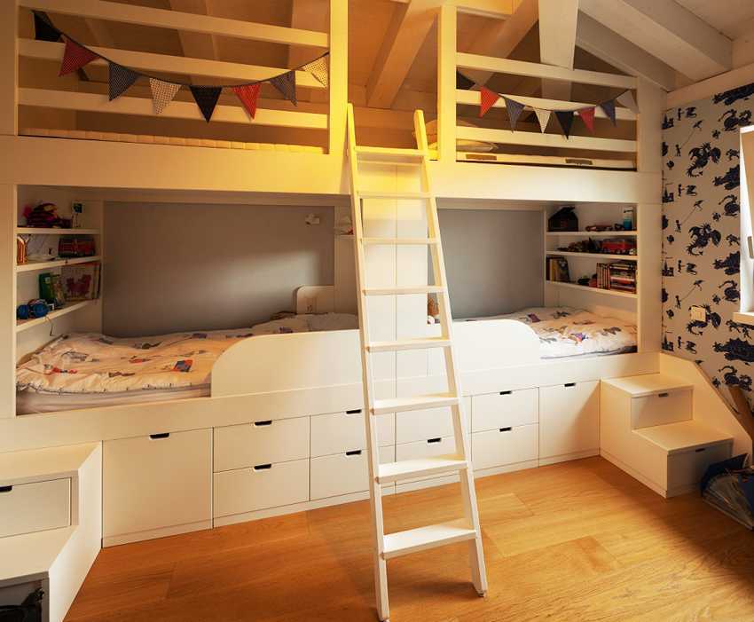 Для двухэтажного кроватки домика можно сделать как просто лесенку, так и лестницу с перилами. Удобней всего для ребенка будет залазить на второй ярус кровати, если лестница будет стоять сбоку, а не посередине кровати.