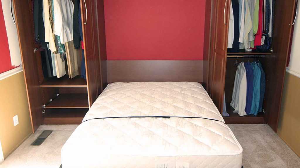 Некоторые откидные кровати в сложенном виде замаскированы под диван со стенкой и даже полкой на ней. Причём предметы на полке при разобранной постели остаются в том же положении и не падают.